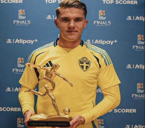 哲凯赖什领取了2024-25赛季欧国联金靴奖,这名前锋打进了15球。